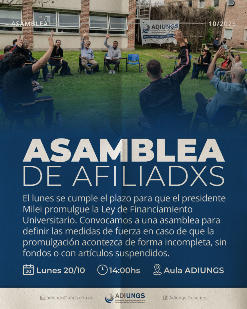 El lunes 20 de octubre se cumple el plazo para que el presidente Milei promulgue la Ley de Financiamiento Universitario. Convocamos a una asamblea de afiliados y afiliadas para definir las medidas de fuerza en caso de que dicha promulgación acontezca de forma incompleta, sin fondos o con artículos suspendidos, como ya sucedió en el caso de la Ley de Emergencia en Discapacidad.