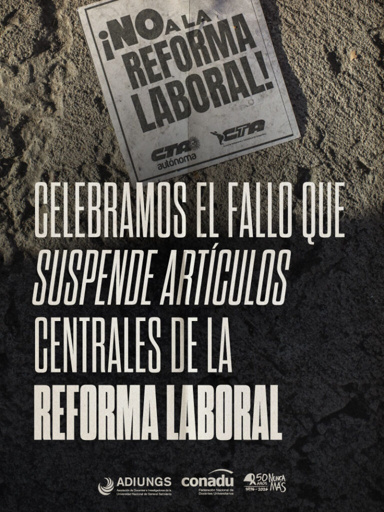 Desde ADIUNGS celebramos el reciente fallo del Poder Judicial que dispuso la suspensión de artículos centrales de la reforma laboral. Si bien el gobierno apelará el fallo, esta decisión constituye un hecho de enorme relevancia institucional y social, ya que reafirma la vigencia del Estado de Derecho y el principio de que ningún gobierno puede avanzar sobre derechos laborales conquistados históricamente por lxs trabajadorxs sin el debido respeto a la Constitución Nacional y a los tratados internacionales en materia laboral.