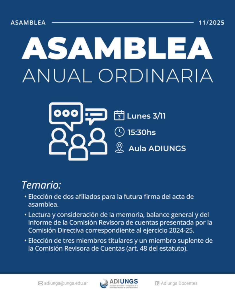 La Comisión Directiva de la Asociación de Docentes e Investigadores de la Universidad Nacional de General Sarmiento (A.D.I.U.N.G.S.) convoca a las afiliadas y los afiliados a la Asamblea Ordinaria, que se llevará a cabo el día lunes 3 de noviembre del corriente a las 15:30hs., en el aula de ADIUNGS, sita en la calle Juan M. Gutiérrez 1150 de Los Polvorines, Prov. de Buenos Aires, a los efectos de considerar el siguiente orden del día:
