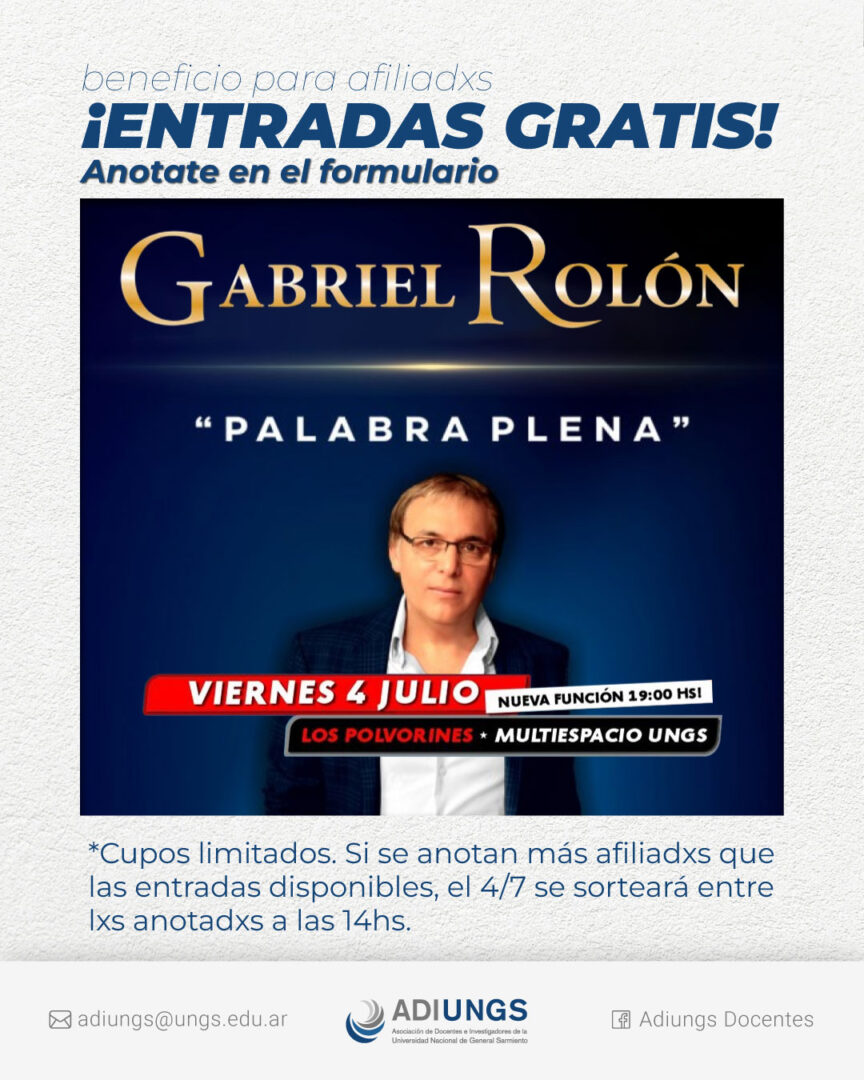 El Viernes 4/7 a las 19:00hs viene Gabriel Rolón con su espectáculo “Palabra Plena” al Multiespacio Cultural de la UNGS y desde ADIUNGS tenemos entradas gratuitas para lxs afiliadxs.
