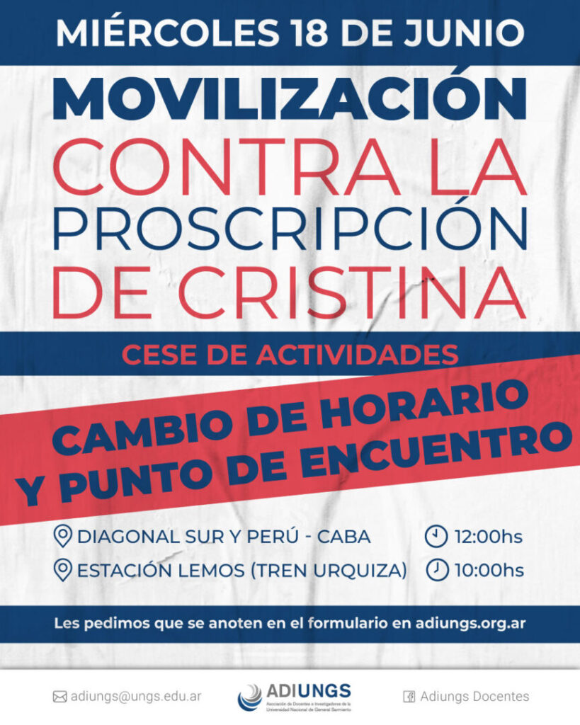 Teniendo en cuenta las últimas noticias, informamos que cambiamos el lugar y horario de la movilización de mañana contra la proscripción de Cristina