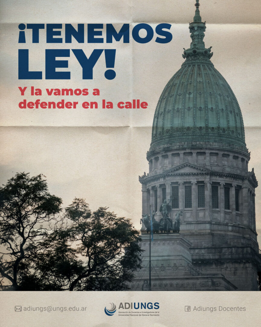 La Comisión Directiva de ADIUNGS celebra con orgullo la aprobación del proyecto de ley de financiamiento universitario que, si bien no es suficiente, implica un paso fundamental en la defensa de la universidad pública, gratuita, inclusiva y de calidad. Este logro no es casualidad: es el resultado de la lucha colectiva, la organización y el compromiso de docentes, estudiantes, no docentes y toda la comunidad educativa que, con convicción y perseverancia, pusieron en agenda la urgencia de garantizar recursos adecuados para nuestras universidades.